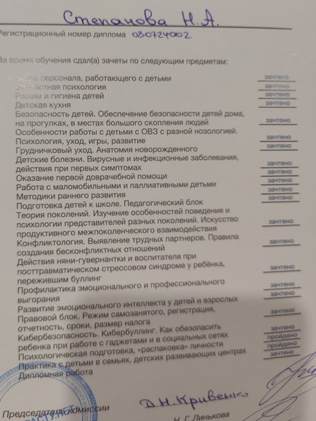 Работала в семье няней- воспитателем школьников 11 и 12 лет. Организация учебного процесса, координация учителей и тренеров. Организация досуга детей и культурных мероприятий, сопровождение на занятия, контроль за гардеробом, глажка белья.