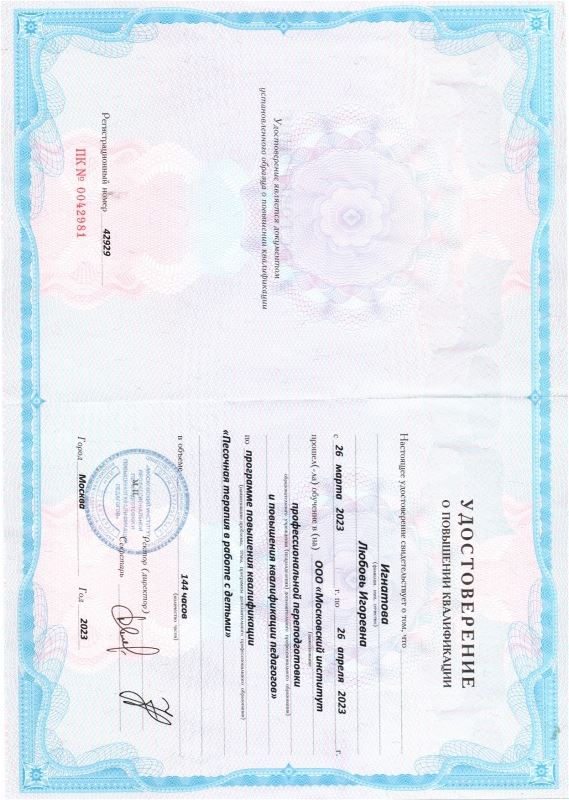 Удостоверение о повышении квалификации. ООО "Московский институт проф. переподготовки и повышения квалификации педагогов. Песочная терапия в работе с детьми. "