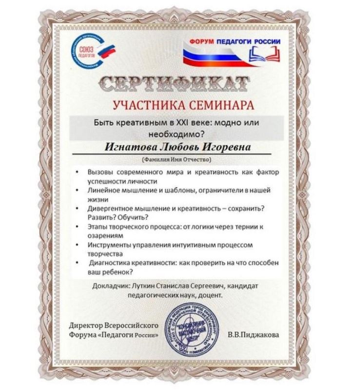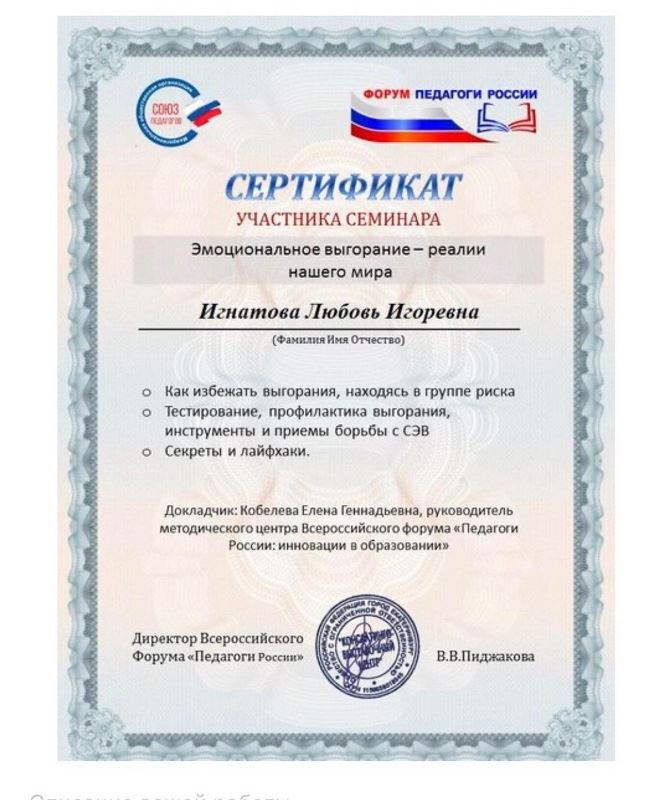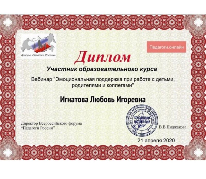 Сертификаты участника вебинара(онлайн педагогика) : Реализация интегративного подхода в начальном общем образовании; Мультимедийное приложение по ИЗО, как средство развития творческой активности школьников; Развивающий потенциал игрушки; Формирование у младших школьников представлений о здоровом образе жизни на уроке окружающего мира; Эмоциональная поддержка при работе с детьми, родителями и коллегами; Как развить креативность? Зарядка для ума: работа с образами; Применение художественных материалов и новых технологий в детском творчестве; Как помочь родителям организовать занятия с детьми дома; Как быть креативным в 21 веке; Юридические аспекты работы педагога и руководителя образовательной организации; Эмоциональное выгорание - реалии нашего мира.