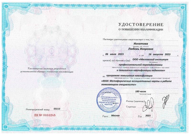 Удостоверение о повышении квалификации ООО"Московский институт профессиональной переподготовки". МАК: Метафорический ассоциативные карты в работе помогающего специалиста.