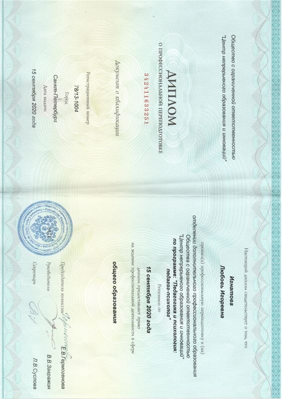 Диплом о проф. переподготовке. Центр непрерывного образования и инноваций. "Педагогика и психология. Педагог- психолог".
