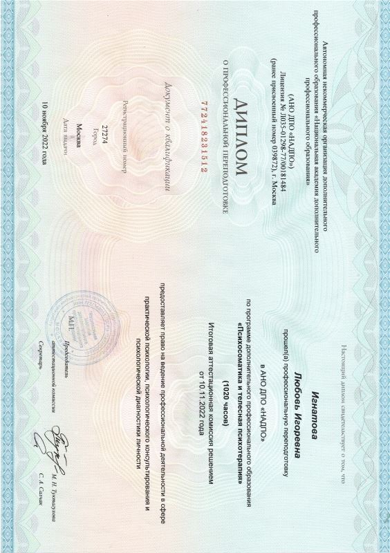 Институт современного образования. Удостоверение о повышении квалификации. Скорочтение и развитие памяти: методы и упражнения. АНО ДПО "НАДПО". Диплом о проф. переподготовке. Психосоматика и телесная психотерапия.
